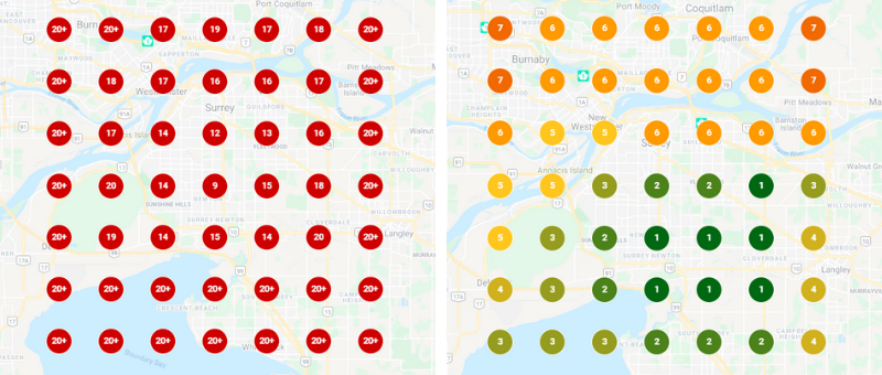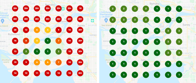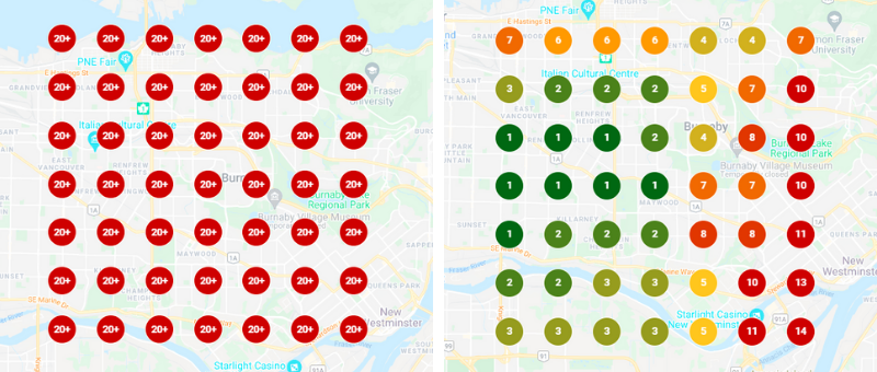 This report gives you a bird’s eye view at multiple scan points to accurately represent mobile search results from latitudes and longitudes throughout an area.